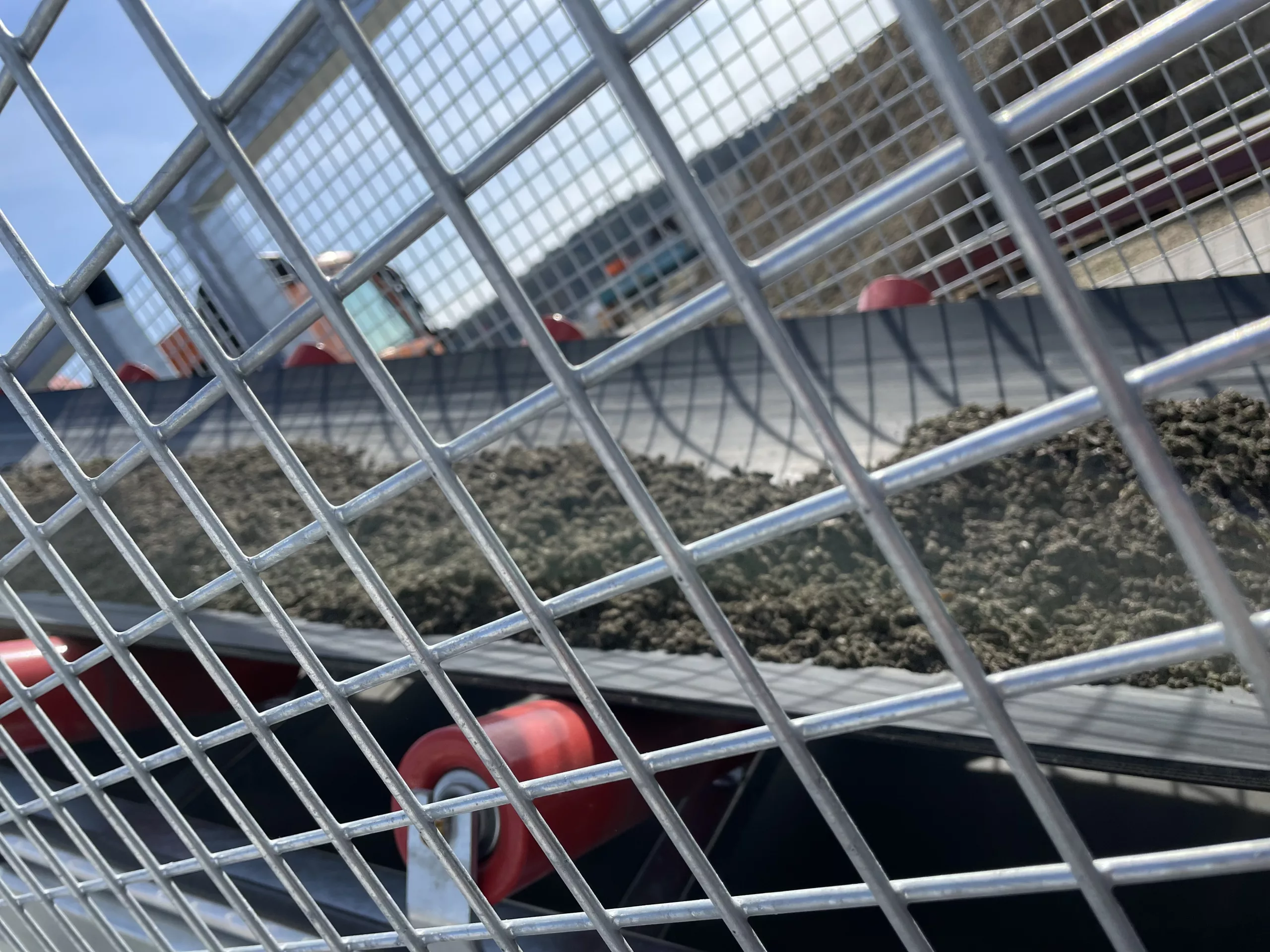 - der erdfeuchte Beton wird über das Förderband ausgegeben