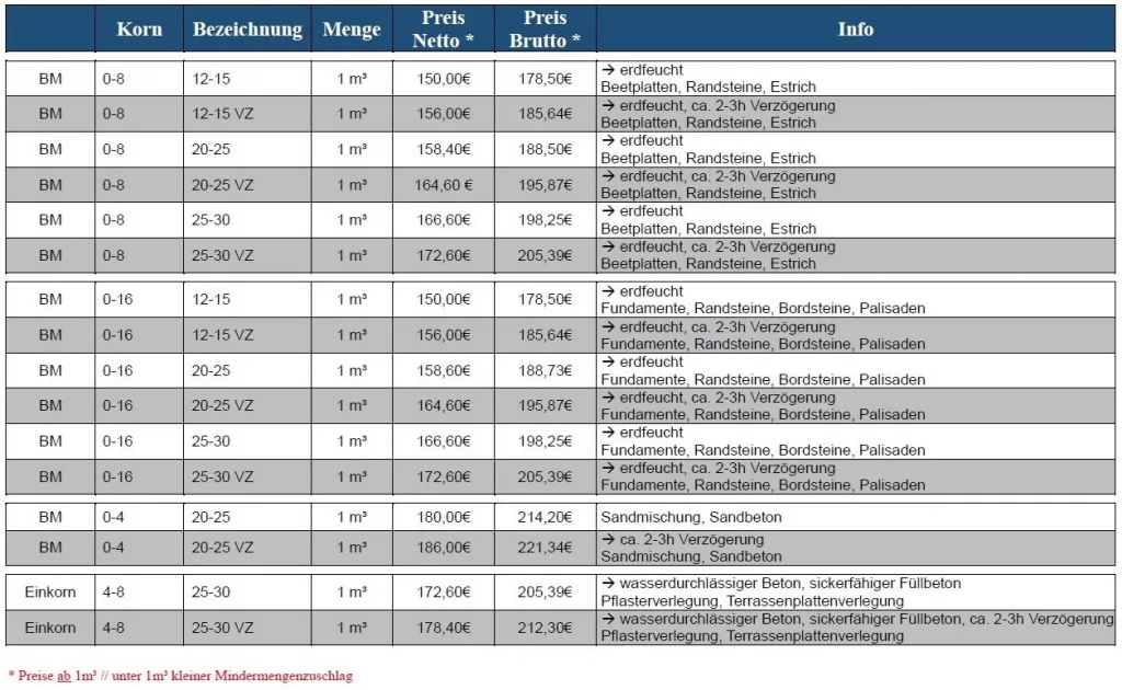 Wir bieten Ihnen einen fertig gemischten Beton in verschiedenen Körnungen an – auf Wunsch auch mit einer Verzögerung von drei Stunden. Als zuverlässiger Partner sind wir für Sie da.